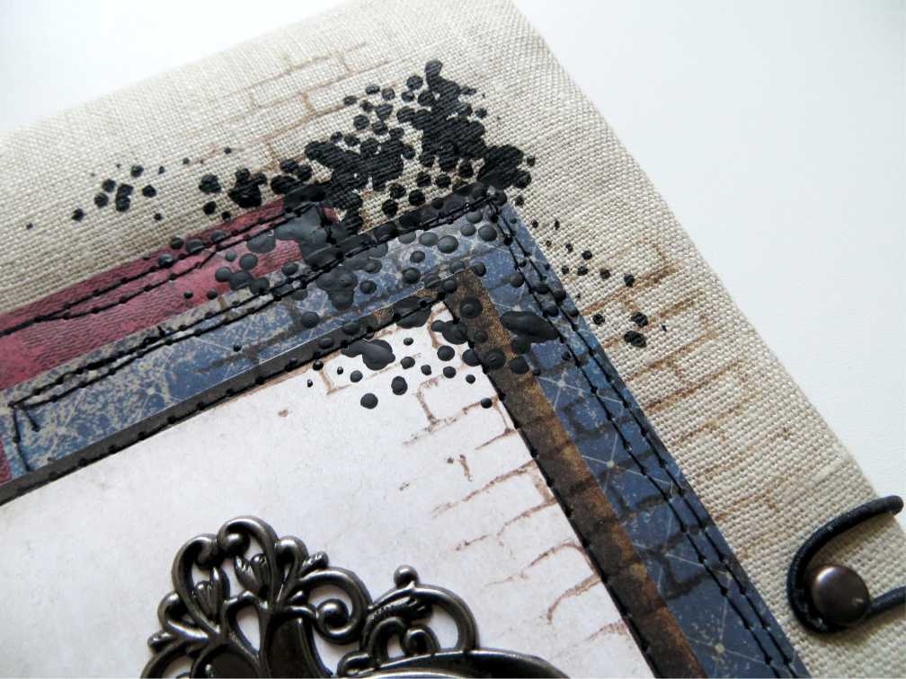Обложка обтянута льном, какую бумагу использовала, честное слово не помню) Рамочка от Тим Хольца, надпись из коллекции Scrapberry's "Фотоархив". Рисунок нанесла с помощью трафарета и пасты и добавила чуть-чуть штампинга. Бумагу пришивала двойным не ровным швом (не знаю понятно ли, что шов намеренно не ровный :)